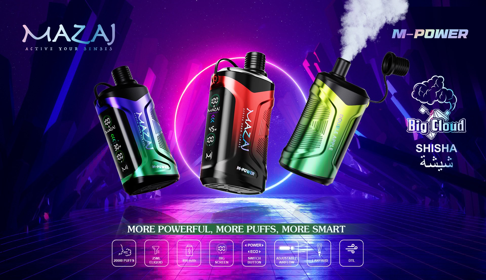 نقدم لكم شيشة مزاج ام باور 20000 سحبة Mazaj M-Power DTL تاتي مع بطارية 850 ملي امبير و سعة النكهة 25 مل و نظامين تحكم حتى 45 واط بالاضافة لشاشة عرض رائعة و نظام تحكم بالاير فلو